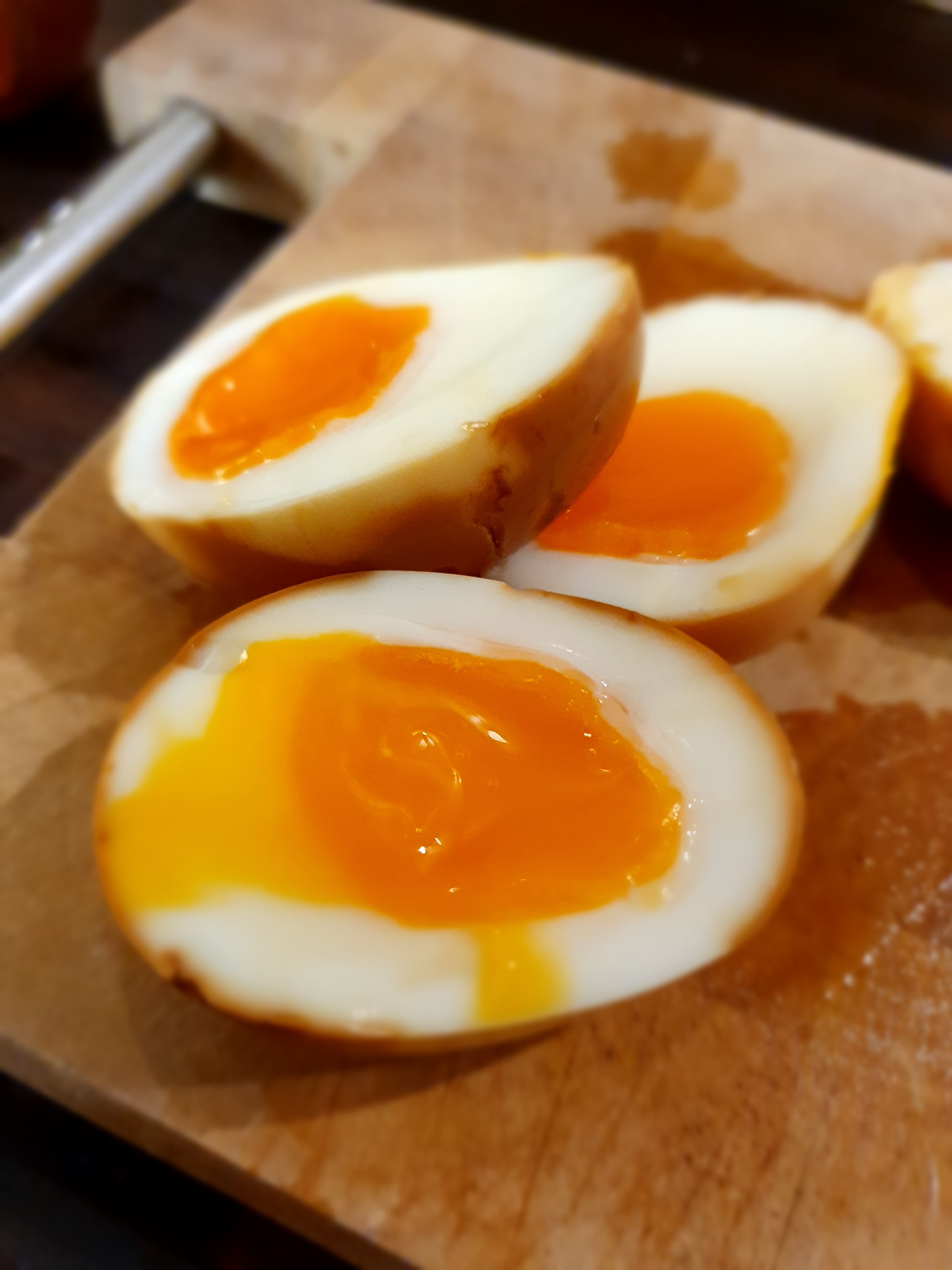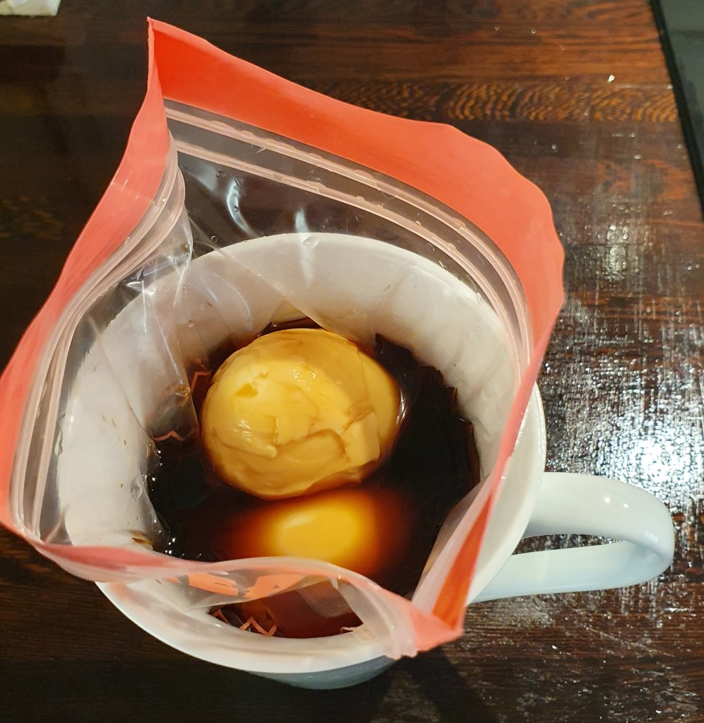 - The first thing you are going to want to do is make your soy stained eggs. To start, boil your eggs to you preferred hardness. That is roughly: 6-7mins for soft, 7-8mins for waxy and 9-10mins for hard-boiled. Once your eggs are cooked, run them under cold water until they are cooled and peel. Next, take a freezer bag and put it inside a mug you won’t miss for a couple of hours. Pop your egg inside the freezer bag and cover with soy sauce. If you’re concerned about how much soy sauce you are using you can top it up with a dash of water.