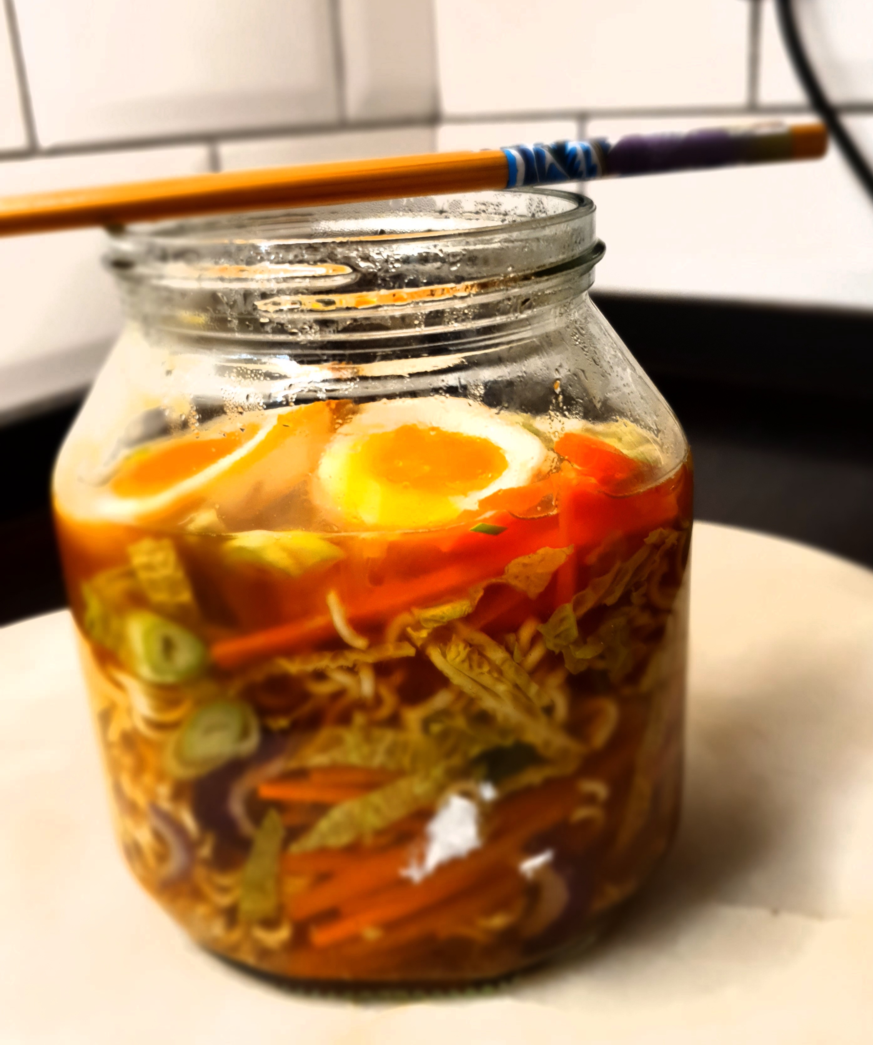 4. After layering your vegetables and noodles you’re pretty much there. If you are prepping this ahead of time these jars can be stored in the fridge until you’re ready to eat them. When you are ready all you need to do is: add enough boiling water to cover your noodles and vegetables. Add your flavouring sachet, or make your own. Shut the lid and let the noodles steep until cooked. Top with your soy eggs cut in half and enjoy!