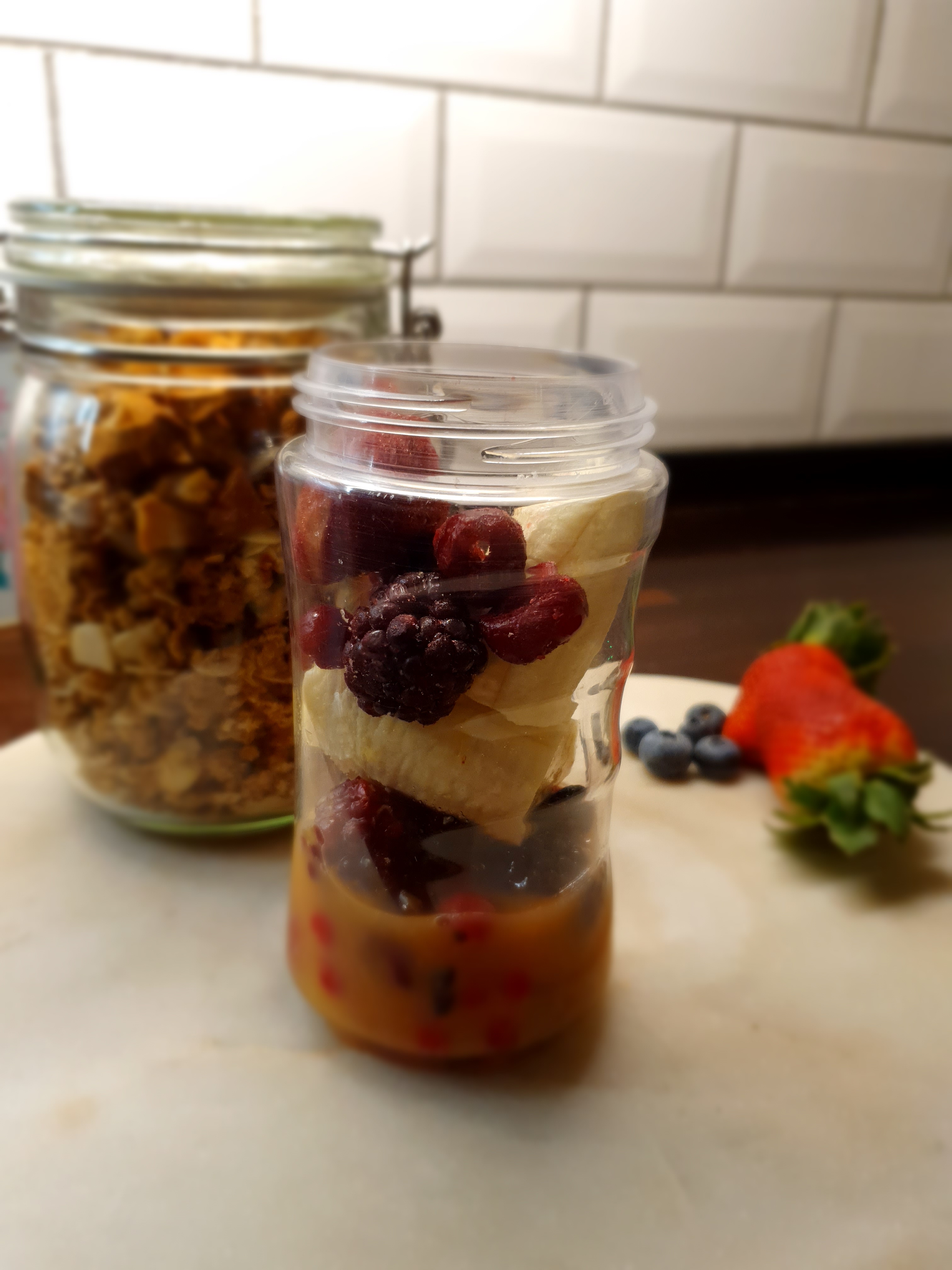 I’ve chosen not to put milk in mine, my chosen liquid is orange juice, but this would work with any type of milk you would rather add. The frozen berries help to keep the smoothie thick and chilled, for that reason I don’t feel the need to add ice. The granola that I used for this recipe can also be found on my blog just click here.