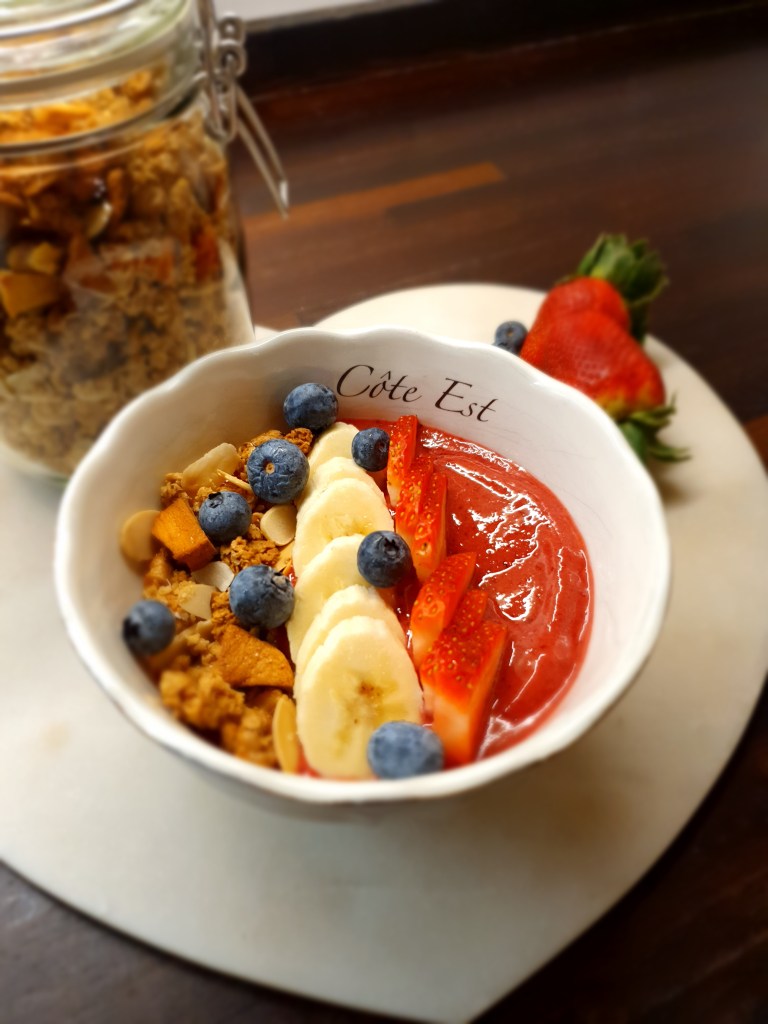 This recipe doesn’t necessarily have a set list of ingredients as it can be changed to suit your needs/what you have available to you. As a start here’s how I created my smoothie bowl.