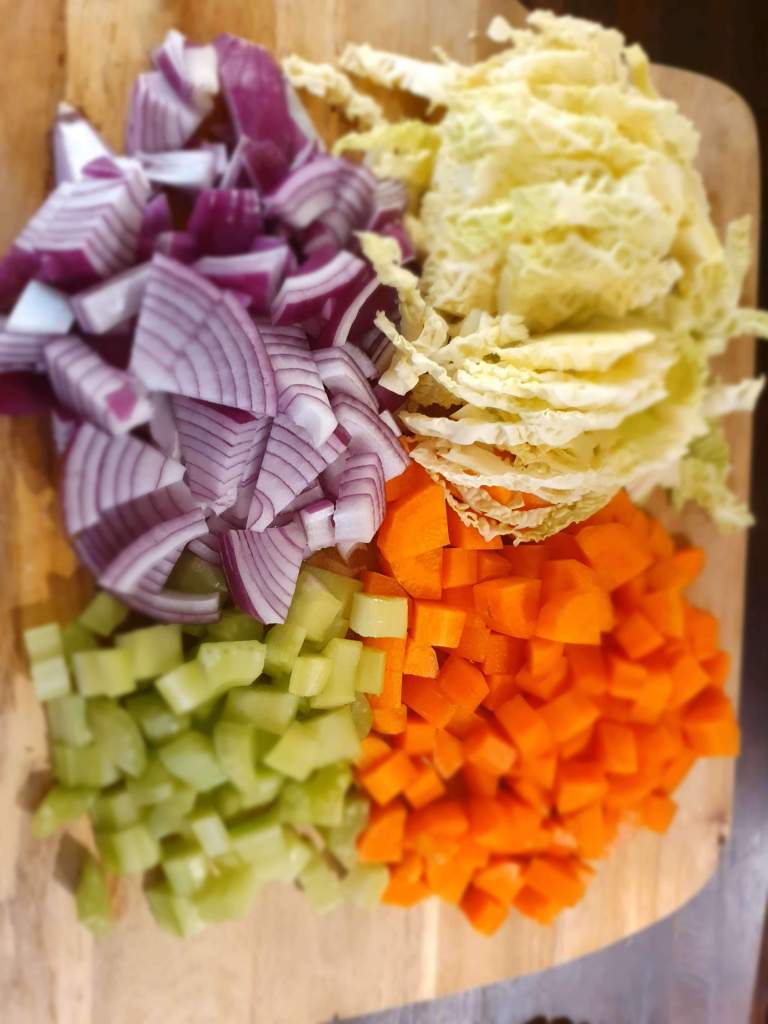 - For the next step we’re going to chop up all the vegetables. This is a rough chop, you don’t want the pieces too small as after four hours of cooking they’ll be small and mushy. As a size guide roughly the same size as your little finger up to the first knuckle. For your cabbage cut slices roughly 1cm thick. At this point peel and mince your garlic.