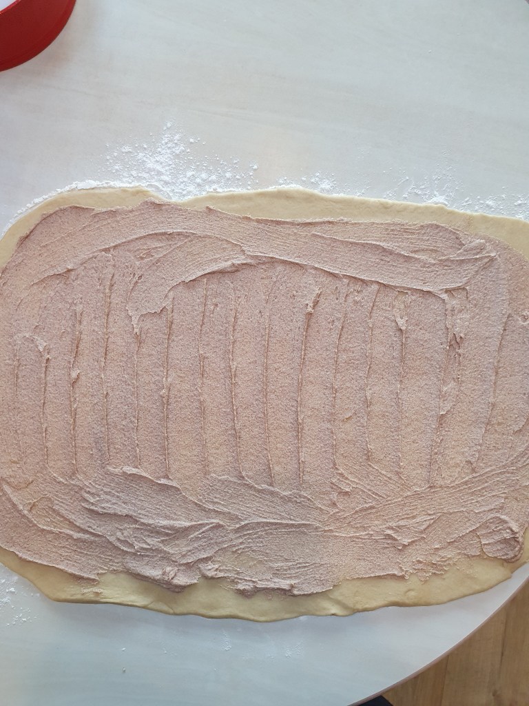 8. In a separate bowl make your filling. Combine your softened butter, sugar and ground cinnamon. Once this has all been mixed together, spread this mixture over your rolled out dough.