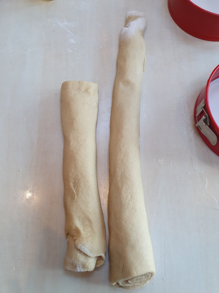 11. Next arrange your cinnamon buns into your greased tins. I used 9″ cake tins, however, you can use a ceramic dish or baking tray. Be careful when handling your buns as the dough is very soft. Once safely in your dish, cover with cling film or a tea towel and leave to prove in a warm place for a hour.